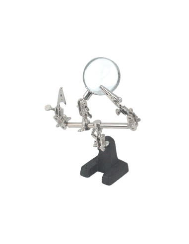 Consists of weighted base, arms ending in crocodile clips, and a magnifying glass, held together by flexible joints. The clips are used to hold light objects in place while the joints allow the user to change the position or angle.
